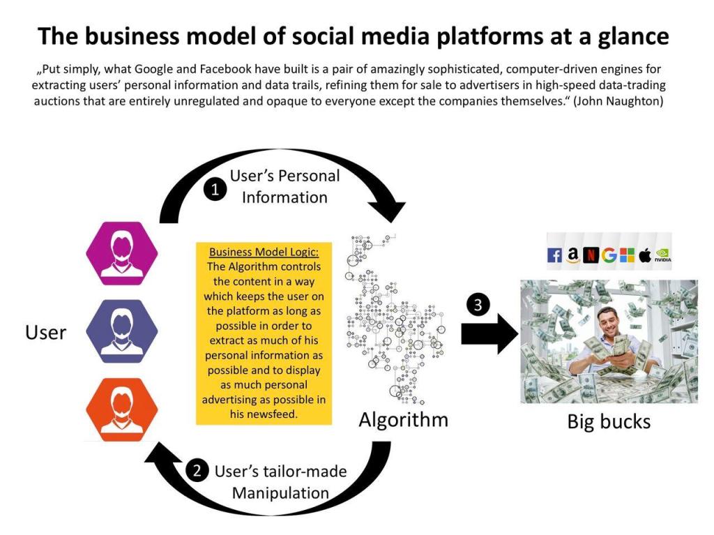 3. Social Media-Plattformen sind Datenkraken, deren Geschäftsmodell darin besteht, durch soziale Verhaltenskontrolle so viele personenbezogene Nutzerdaten wie möglich zu sammeln und diese mit Hilfe von Persuasive Computing und Microtargeting zu monetarisieren (siehe Grafik). Dieses Geschäftsmodell gefährdet den Zusammenhalt in der Gesellschaft und den Bestand unserer Demokratie.
