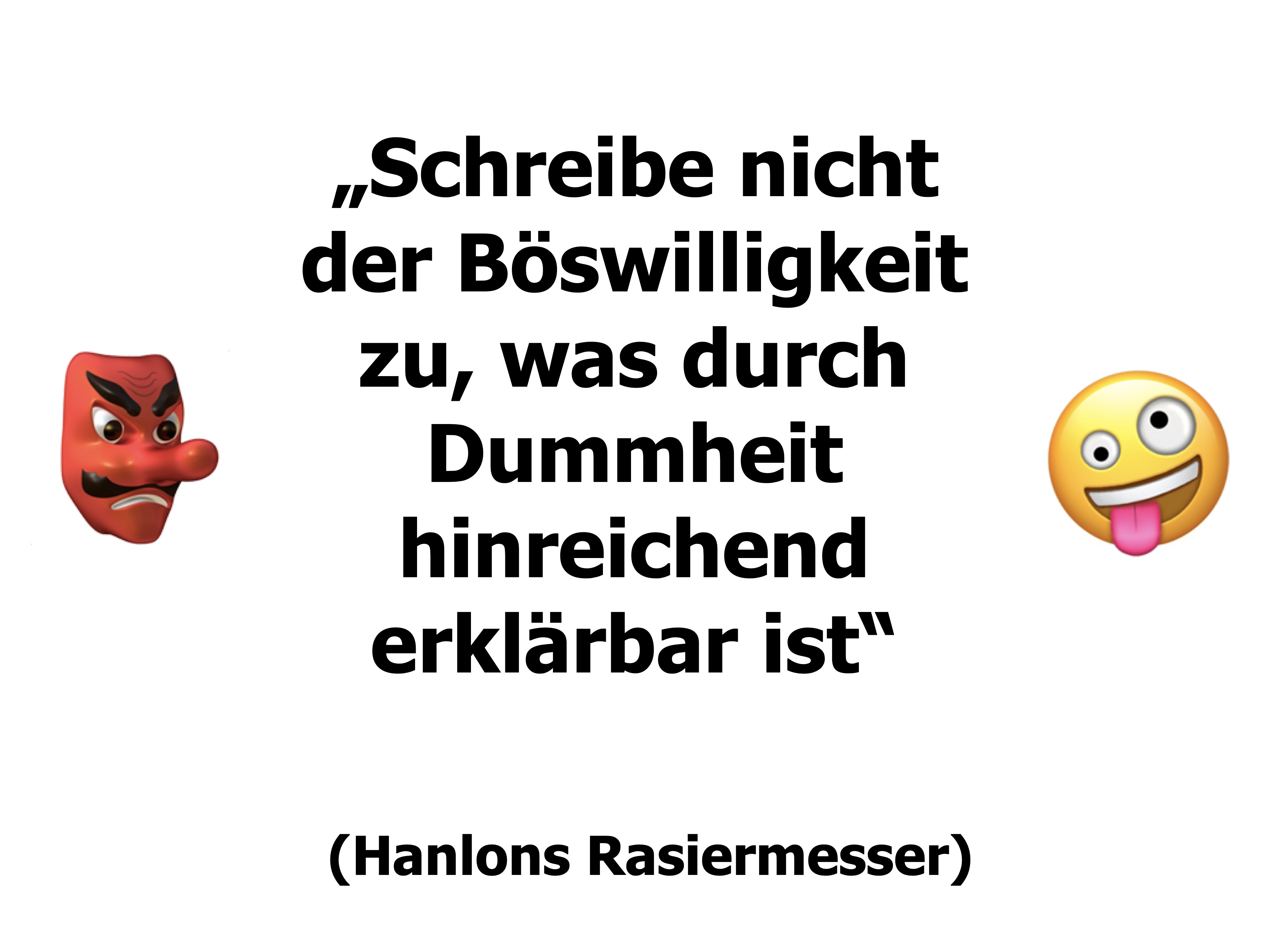 Der englische Begriff „Hanlon’s Razor“ (auf Deutsch: „Hanlons Rasiermesser„) bezeichnet ein Sprichwort, welches etwas über den wahrscheinlichsten Grund für menschliches Fehlverhalten aussagt. Es lautet: „Schreibe nicht der Böswilligkeit zu, was durch Dummheit hinreichend erklärbar ist“ (auf Englisch: „Never attribute to malice that which can be adequately explained by stupidity“). Oder kürzer: „Geh nicht von Böswilligkeit aus, wenn Dummheit genügt“ (auf Englisch: „Never assume malice when stupidity will suffice“).