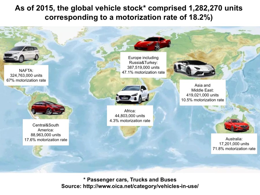 Man muss diese Verkaufszahlen in Relation setzen zu einem globalen Kraftfahrzeugbestand von 1,3 Milliarden Einheiten (Stand: 2015) mit der folgenden regionalen Verteilung bei den Motorisierungsraten: