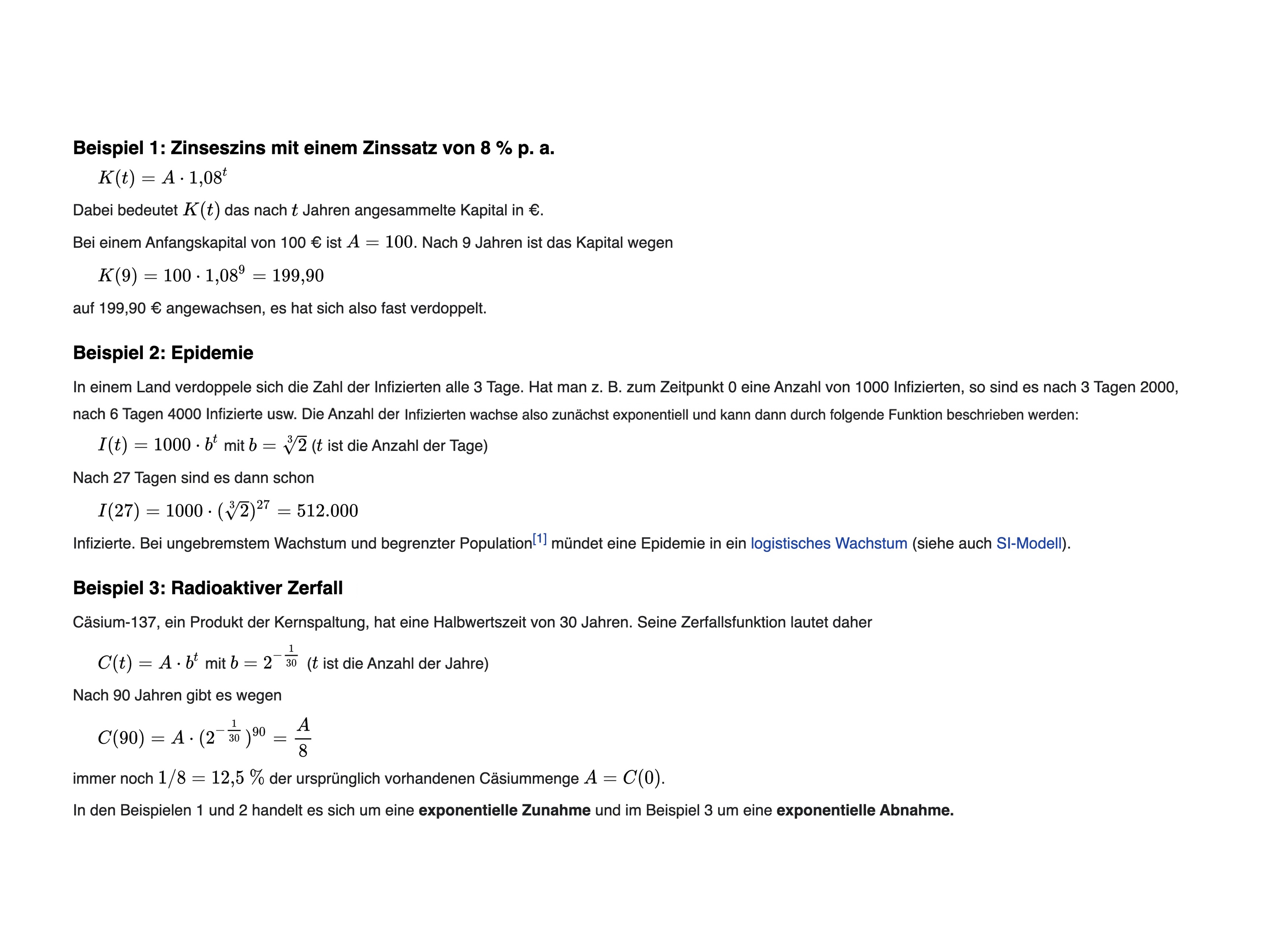 Drei Beispiele „aus dem richtigen Leben“ für echtes exponentielles Wachstum bzw. exponentiellen Zerfall sind der Zinseszins mit einen festen Zinssatz von z. B. 8 %, die Ausbreitung einer Epidemie wie Covid-19 oder der radioaktive Zerfall von Produkten der Kernspaltung wie Caesium-137. Die folgende Grafik stammt aus einem WIKIPEDIA-Artikel zum Thema „Exponentielles Wachstum“: