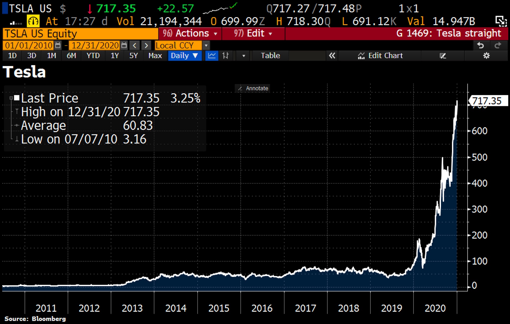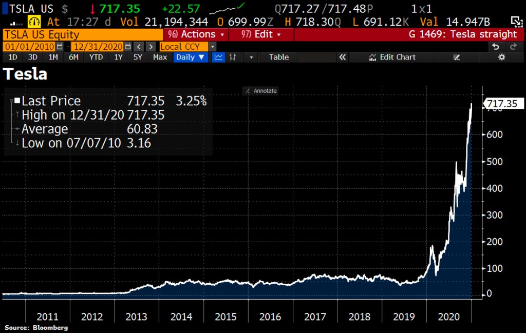 Nach der Aufnahme in den Standard & Poor’s (S&P500) Aktienindex am 21.12.2020 erreichte Tesla Ende 2020 mit einer Marktkapitalisierung von rund 680 Milliarden US-Dollar einen Börsenwert, welcher der Summe der Börsenwerte von Volkswagen (1), Toyota (2), Daimler (3), Ford (4), General Motors (5), Honda (6), SAIC (7), BMW (8), Nissan (9) und Dongfeng (10) entsprach – das waren gemessen an den Umsätzen im Jahr 2019 die Top 10-Autohersteller auf unserem Planeten, die in 2019 zusammen mehr als 57 Millionen Personenkraftwagen verkaufen konnten. Entscheiden Sie selbst, ob das gerechtfertigt ist und wie nachhaltig diese Bewertung sein kann.