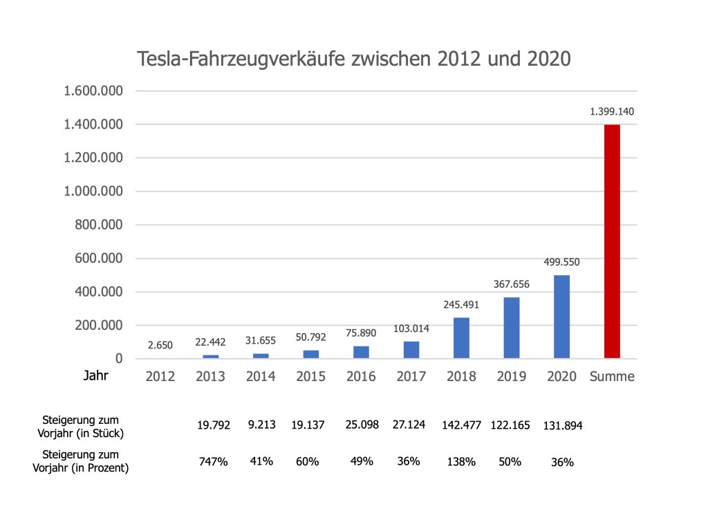 Schauen wir uns nun einmal die Entwicklung der Fahrzeugverkäufe von Tesla zwischen 2012 und 2020 an – einschließlich der Steigerungsraten in absoluten Zahlen und prozentual jeweils im Vergleich zum Vorjahr: