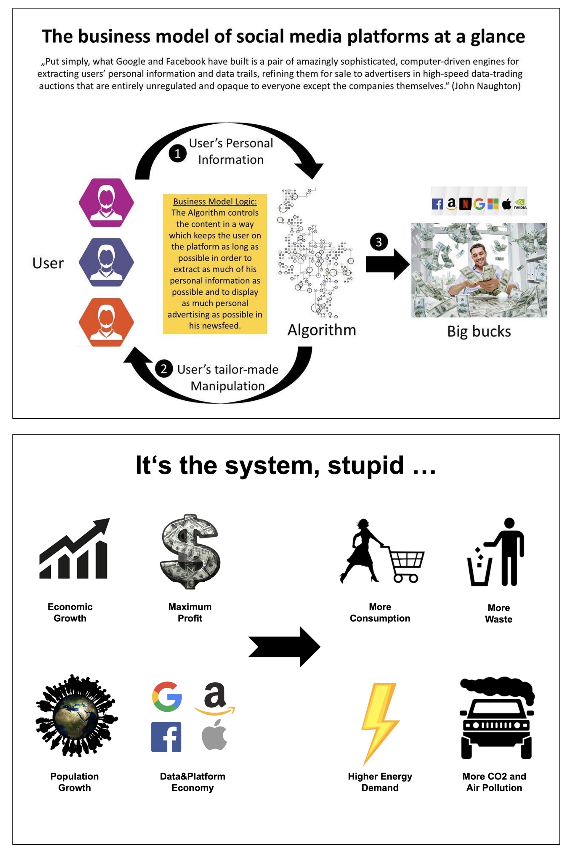 - Da Social Media-Plattformen nichts anderes sind, als riesige Maschinen zu gezielten Bespielung von Nutzern mit Werbung, beeinflussen sie das Konsumverhalten der Nutzer und tragen dazu bei, dass diese mehr Ressourcen und Energie verbrauchen und mehr Abfall und Emissionen erzeugen.