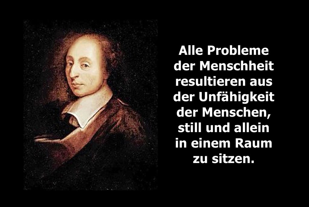 Blaise Pascal (* 19. Juni 1623 in Clermont-Ferrand; † 19. August 1662 in Paris) war ein französischer Mathematiker, Physiker, Literat und christlicher Philosoph. Von ihm stammt das bemerkenswerte Zitat: „Alle Probleme der Menschheit resultieren aus der Unfähigkeit der Menschen, still und allein in einem Raum zu sitzen.“