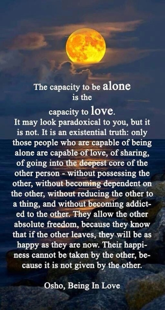 Der indische Philosoph und Begründer der Neo-Sannyas-Bewegung, Osho (* 11. Dezember 1931 in Raisen/Indien, † 19. Januar 1990 in Pune/Indien) schlug in die gleiche Kerbe mit seinem ebenso bemerkenswerten Zitat: „Die Fähigkeit, allein zu sein, ist die Fähigkeit zu lieben. Das mag Ihnen paradox vorkommen, ist es aber nicht. Es ist eine existenzielle Wahrheit: Nur die Menschen, die fähig sind, allein zu sein, sind fähig zu lieben, zu teilen, in den tiefsten Kern einer anderen Person einzudringen – ohne den anderen zu besitzen, ohne vom anderen abhängig zu werden, ohne den anderen auf eine Sache zu reduzieren und ohne vom anderen abhängig zu werden. Sie lassen dem anderen absolute Freiheit, weil sie wissen, dass sie, wenn der andere geht, genauso glücklich sein werden wie jetzt. Ihr Glück kann ihnen nicht vom anderen genommen werden, weil es nicht vom anderen gegeben wird.“