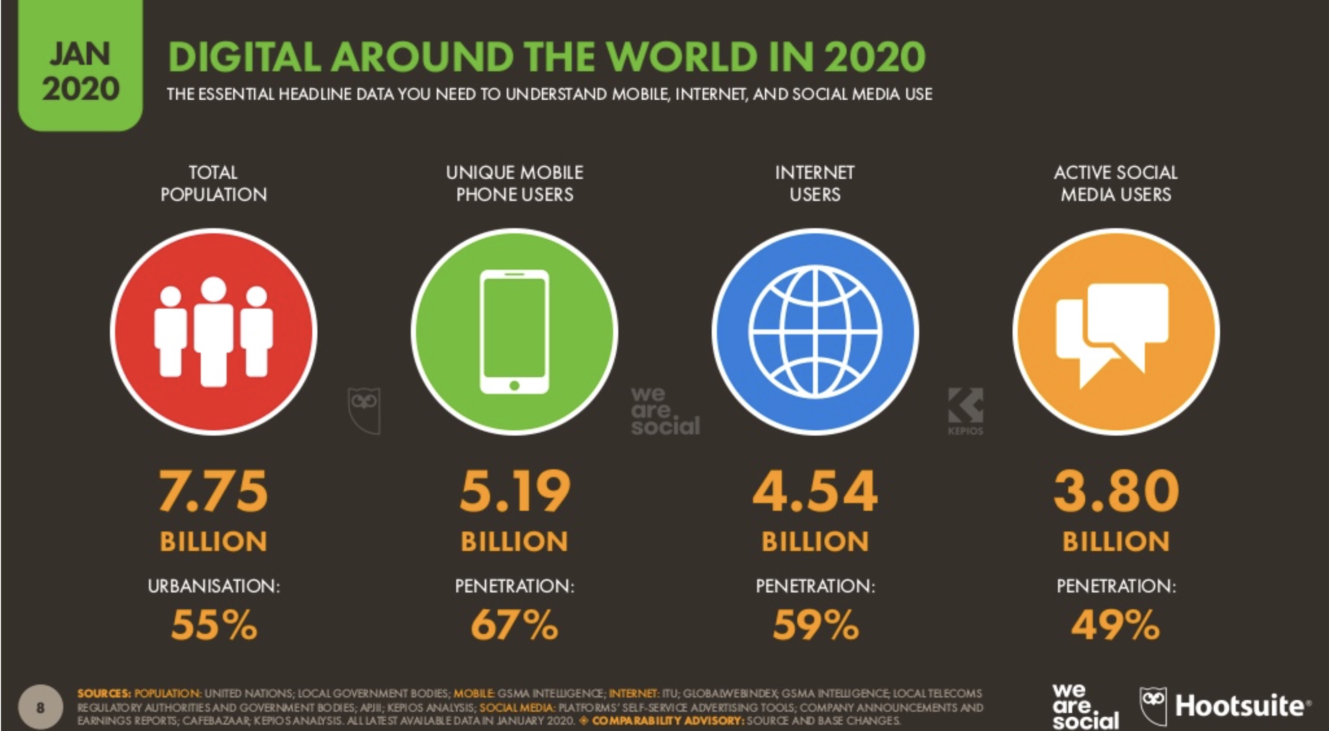 Laut dem „Digital 2020„-Report von We are Social und Hootsuite hatten Anfang 2020 von 7,75 Milliarden Erdenbürgern, von denen 55% in Städten lebten, 5,19 Milliarden ein Mobiltelefon (67%), 4,54 Milliarden nutzten das Internet (59%) und 3,8 Milliarden waren aktive Social Media-Nutzer (49%) mit Google und Facebook als Social Media-Plattformen mit der größten Reichweite und den höchsten Werbeeinnahmen.