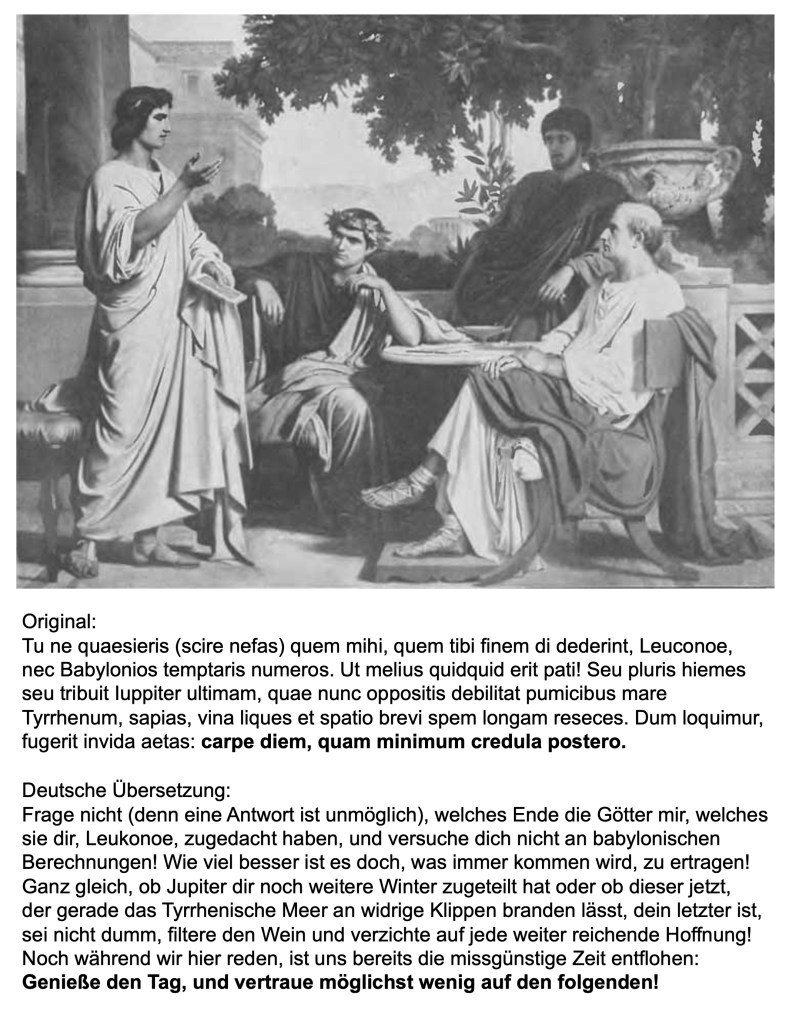 Horaz (65 v. Chr. – 8 v. Chr), eigentlich Quintus Horatius Flaccus, gilt neben Vergil, Properz, Tibull sowie Ovid als einer der bedeutsamsten Dichter des augusteischen Zeitalters der Antike. Horaz‘ künstlerisches Gesamtwerk enthält zahlreiche Oden, einige Satiren sowie mehrere Briefgedichte, welche als Episteln bekannt geworden sind. Der lateinische Sinnspruch „carpe diem“, der sich mit „Pflücke den Tag“ oder „Genieße den Tag“ übersetzen lässt, geht auf die Ode „An Leukonoë“ zurück, welche von Horaz um 23 v. Chr verfasst wurde. In der letzten Verszeile der Odenstrophe findet sich die bekannte Wortfolge. Diese stellt einen Appell dar, die knappe Lebenszeit zu genießen und nicht auf morgen zu verschieben. Der Ausspruch ist zum geflügelten Wort geworden und wird teilweise auch als „Nutze den Tag“ wiedergegeben. Diese Übersetzung trifft aber nicht in Gänze die Intention, die Horaz mit den Wörtern „carpe diem“ verfolgte. Die folgende Grafik zeigt den Kontext des Zitates: