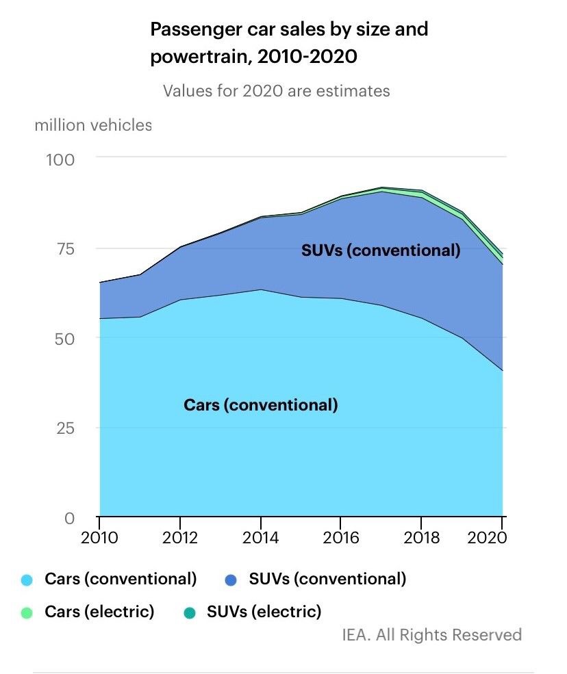 Die folgende aktuelle Grafik der International Energy Agency (IEA) zeigt die Entwicklung der globalen Pkw-Verkaufszahlen (Neuzulassungen) zwischen 2010 und 2020, also in der letzten Dekade, in der Elektroautos zunehmend als „alternativloses“ Mobilitätskonzept für die individuelle Mobilität der Zukunft dargestellt und subventioniert wurden. In der Grafik wird differenziert nach Pkw mit konventionellen Verbrennungsmotoren, Sports Utility Vehicles (SUV) mit konventionellen Verbrennungsmotoren, Pkw mit Elektoantrieb und SUVs mit Elektroantrieb. Quelle: https://t1p.de/y4zq
