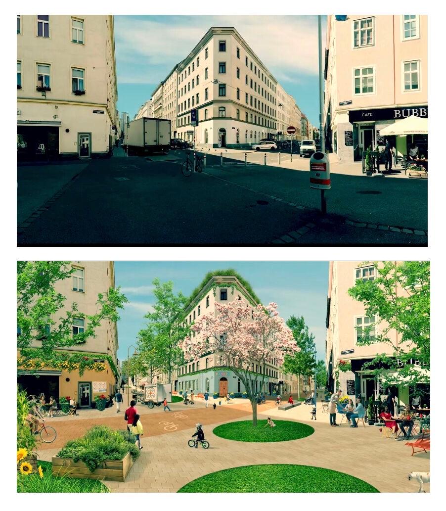Zwei Videoanimationen (Kohlgasse in Wien: https://t1p.de/x12m und Hoheluftchaussee in Hamburg: https://t1p.de/l7r9) illustrieren, wie sehr man die Lebensqualität für die Bewohner von Großstädten aufwerten könnte, wenn es gelingen würde, mittels ÖPNV, Mobility Sharing und Fahrrad die Fahrzeugdichte und den Flächenverbrauch durch Pkw drastisch zu reduzieren und die freiwerdenden Flächen zu begrünen bzw. durch Fuß- und Radwege zu ersetzen. Die folgenden Screenshots stammen aus der Videoanimation für die Kohlgasse in Wien: