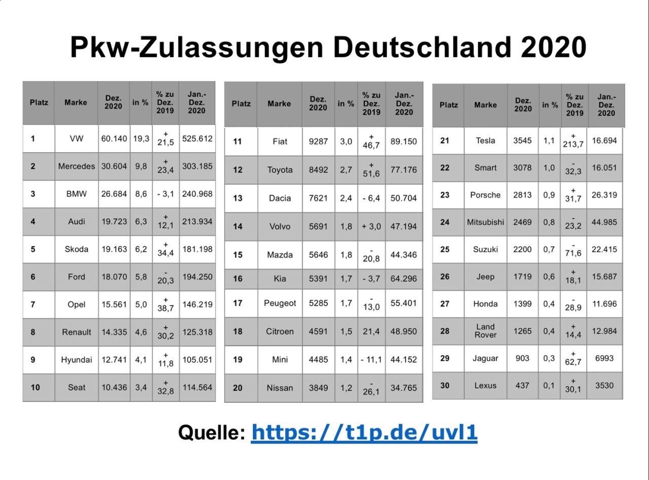 Ein paar „Highlights“ aus der deutschen Pkw-Zulassungsstatistik 2020 (Quelle: https://t1p.de/3rkb):