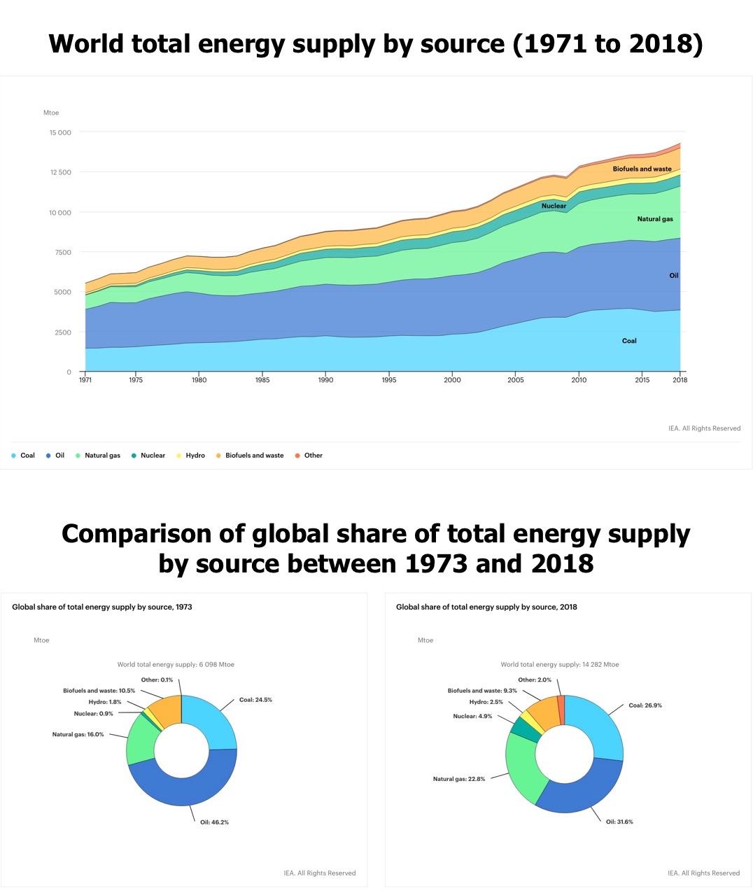 Noch ein wichtigerHinweis zur Transformation der Energieproduktion weg von fossilen Brennstoffen hin zu erneuerbaren Energien: Die anhängende IEA-Grafik zeigt die Entwicklung der Weltenergieproduktion zwischen 1971 und 2018, die eine kontinuierliche Steigerung des Weltenergiebedarfs decken musste (oben) und den Vergleich der Energiequellen, aus denen die Weltenergieproduktion in den Jahren 1973 und 2018 gespeist wurde (unten).