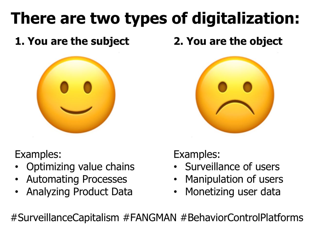 Wie die folgende Grafik illustriert, gibt es zwei Arten von Digitalisierung: Bei der ersten Variante ist der Mensch das Subjekt (also derjenige der etwas tut) und dieses Subjekt profitiert, z. B. von der Optimierung von Wertschöpfungsketten, der Automatisierung von Prozessen oder der Analyse von Produktdaten. Bei der zweiten Variante ist der Mensch das Objekt (also derjenige, mit dem etwas getan wird), dessen Leben überwacht, „verdatet“, monetarisiert und manipuliert wird.