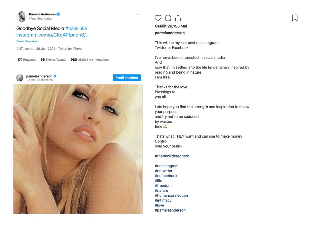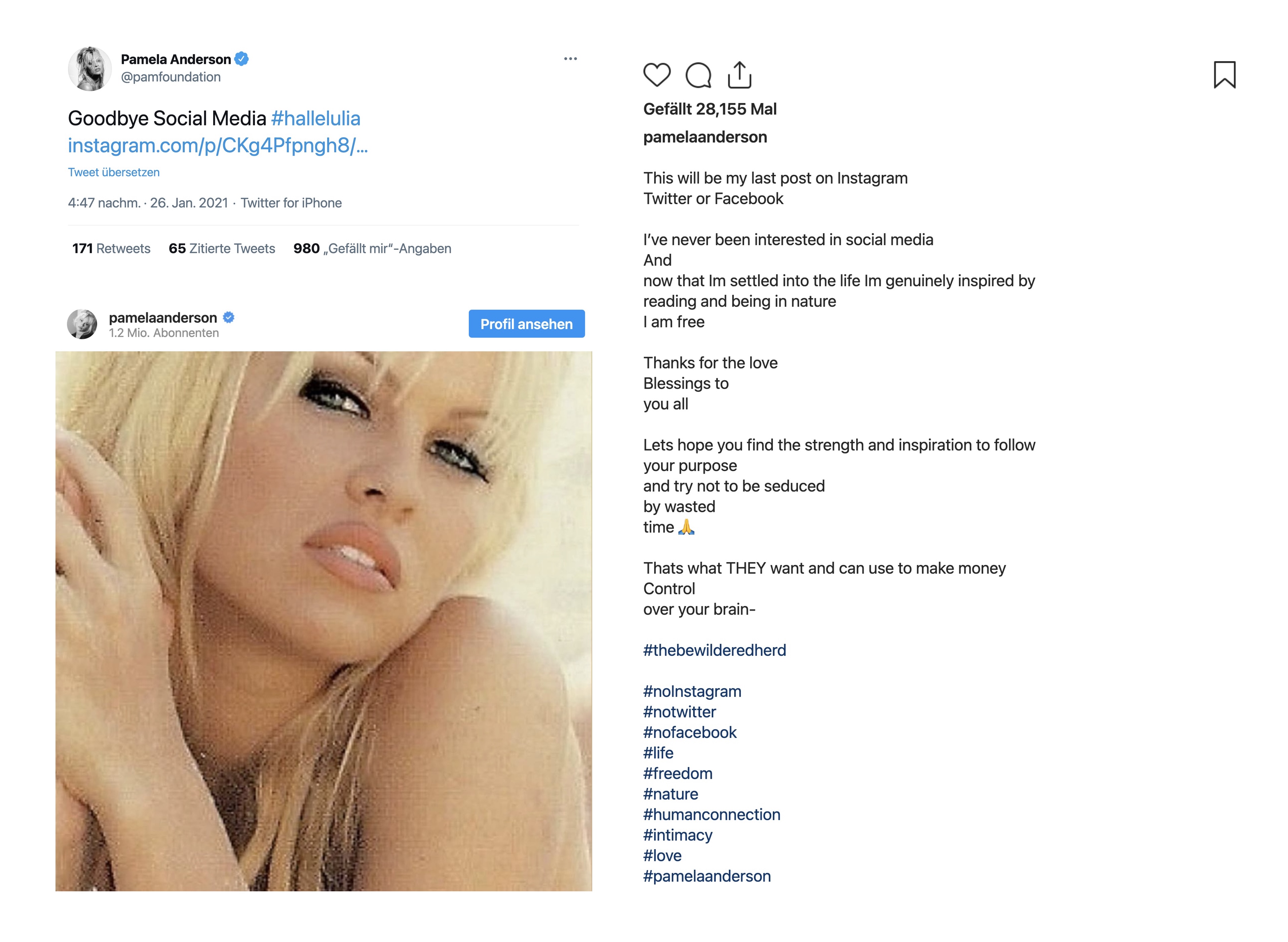P.S.: Sie kennen vermutlich Pamela Anderson, Schauspielerin und Model, aus Filmen und Serien wie „Baywatch“. Seit über 30 Jahren führt diese Pamela Anderson ein Leben in der Öffentlichkeit: „Playboy“, Fernsehen, rote Teppiche, öffentliches Beziehungsleben, soziale Netzwerke. Doch offenbar hat sie nun genug davon und kündigte am 26.01.2021 ihren Abschied aus den Social Media-Netzwerken an. Die 53-jährige Anderson erklärte in gleichlautenden Postings auf Instagram, Facebook und Twitter, allen Social-Media-Kanälen für immer den Rücken kehren zu wollen. Ihre Begründung unter der Überschrift „Goodbye Social Media“ finde ich bemerkenswert (siehe folgender Screenshot):