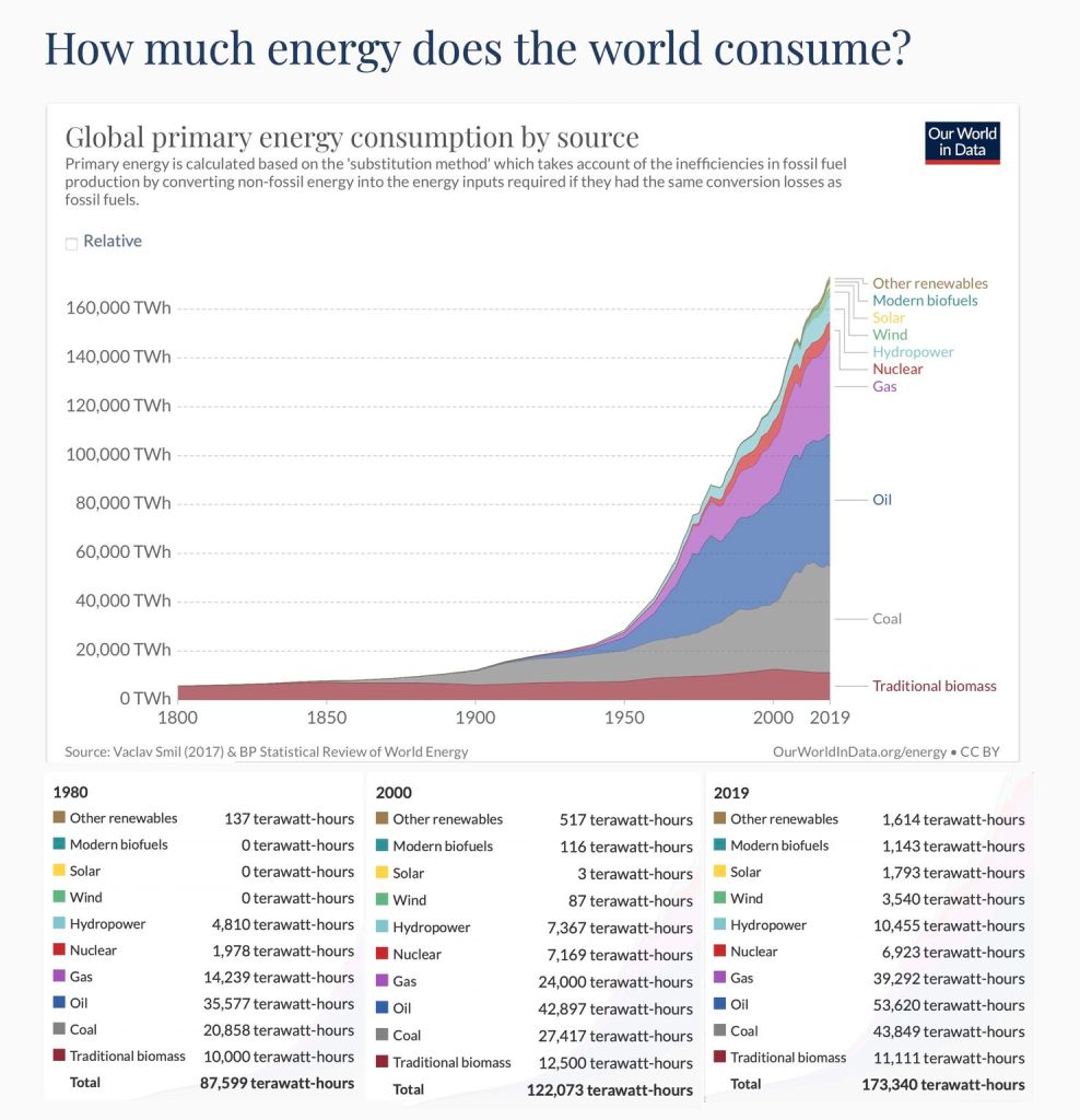- Ebenfalls zwischen 1980 und 2019 wuchs der weltweite Primärenergieverbrauch von 87.599 Terawattstunden auf 173.430 Terawattstunden (ein Anstieg von 97,8 %).