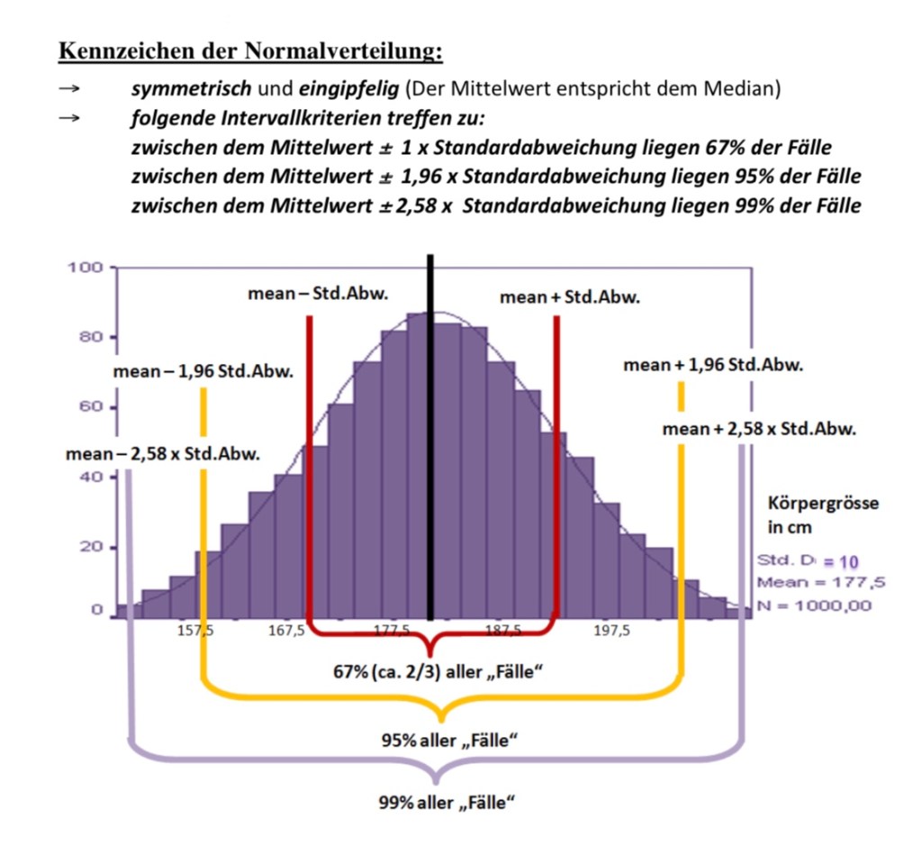 Die Gaußsche Normalverteilung ist das „Schweizer Taschenmesser“ der Statistik. Die Gaußsche Normalverteilung ist die wichtigste Verteilung der Statistik und wird sowohl in Naturwissenschaften als auch in Geistes- und Wirtschaftswissenschaften bei statistischen Auswertungen für Gruppen verwendet, deren tatsächliche, den Daten zugrunde liegende Verteilungsfunktion unbekannt ist. Beispiel: Intelligenz, Körpergröße (eines einzigen Geschlechts), sogar Sozialkompetenz: all diese Werte sind normalverteilt. So sind die meisten Menschen durchschnittlich groß und nur sehr wenige sehr groß oder sehr klein. Sogar Einkommen wird normalverteilt, wenn man die Daten vorher logarithmiert. Nach der Gaußschen Normalverteilung gibt es am rechten und linken Rand jeder größeren sozialen Gruppe je ca. 16,5 % Menschen mit extremen Ansichten oder extremem Verhalten, während die Mitte von ca. 67 % mehr oder weniger unauffälligen „Normalos“ gebildet wird (siehe Grafik). Wirft man gelegentlich einen Blick in Facebook oder Twitter, könnte man leicht den Eindruck gewinnen, dass die Relationen umgekehrt sind, dass es also 67 % Bekloppte und nur 33 % Normalos gibt. Aber das ist ein anderes Thema …